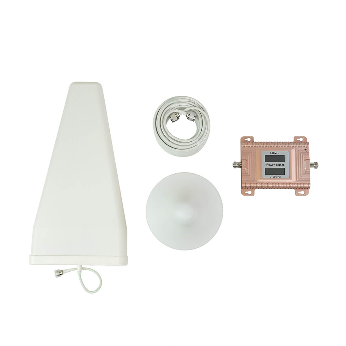 Комплект усилителя сигналов сотовой связи GSM 900/2100 МГц стандартов 2G и 3G. Помимо блока усиления в белом металлическом корпусе с небольшим ЖК дисплеем, в комплекте уличная направленная антенна и комнатная антенна круговой направленности. Обе антенны помещены в пластиковые футляры дли создания эстетичного внешнего вида и защиты от атмосферных влияний. В комплекте так же соединительный коаксиальный кабель, адаптер питания для блока усиления, металлический крепеж для антенн. Общий коэффициент усиления комплекта не менее 70 dbi.